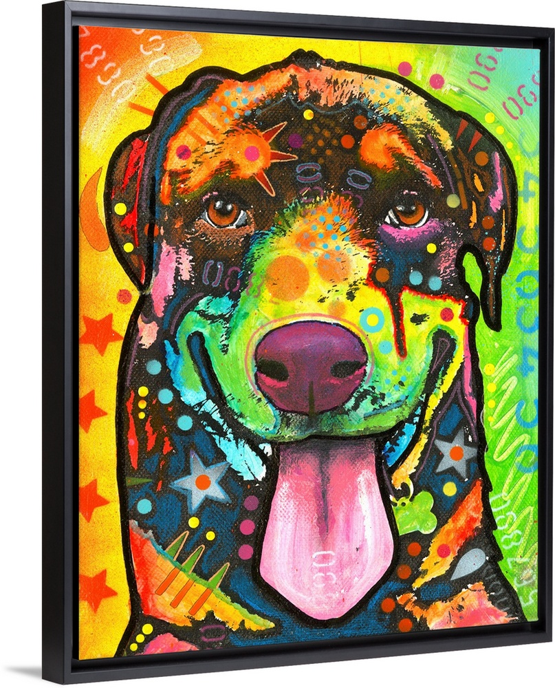 <p>Colorful painting of a Rottweiler with abstract marking and designs all over.</p>