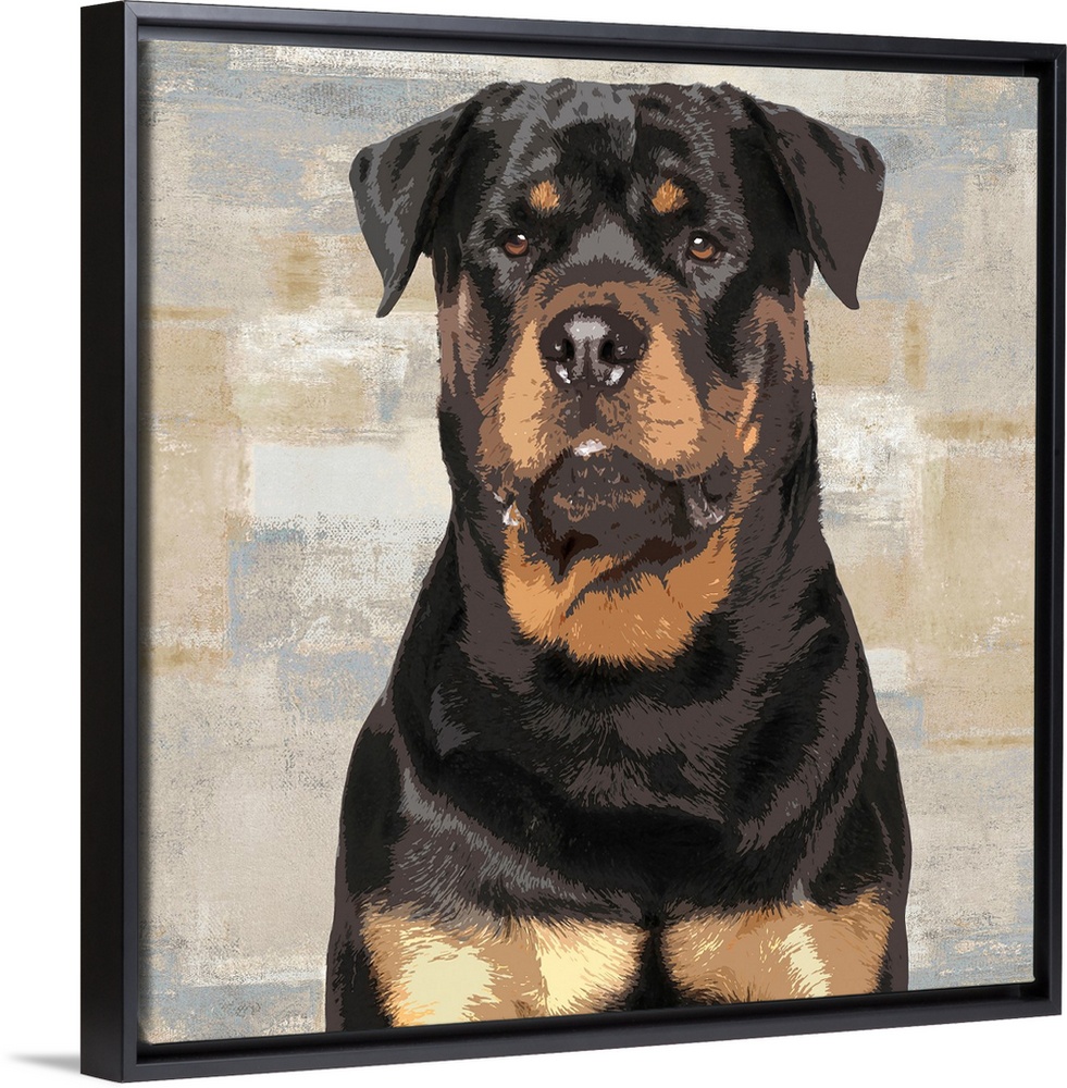 <p>Square decor with a portrait of a Rottweiler on a layered gray, blue, and tan background.</p>