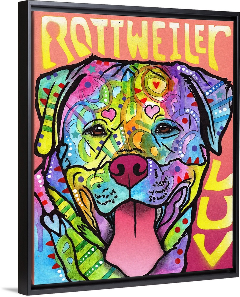 <p>"Rottweiler Luv" written around a colorful painting of a Rottweiler with abstract markings.</p>