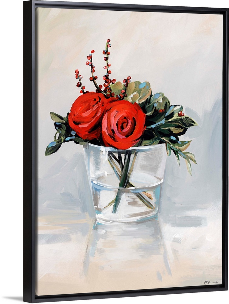 <p>Contemporary artwork of red roses in a clear glass vase.</p>