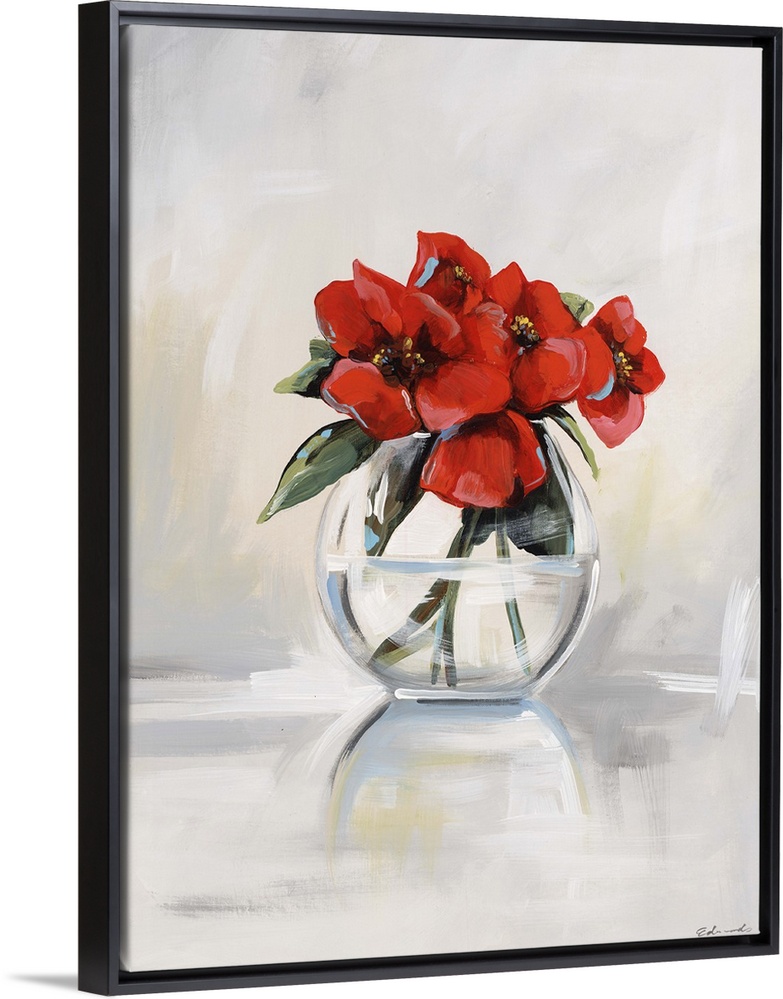<p>Contemporary artwork of red poppies in a clear glass vase.</p>