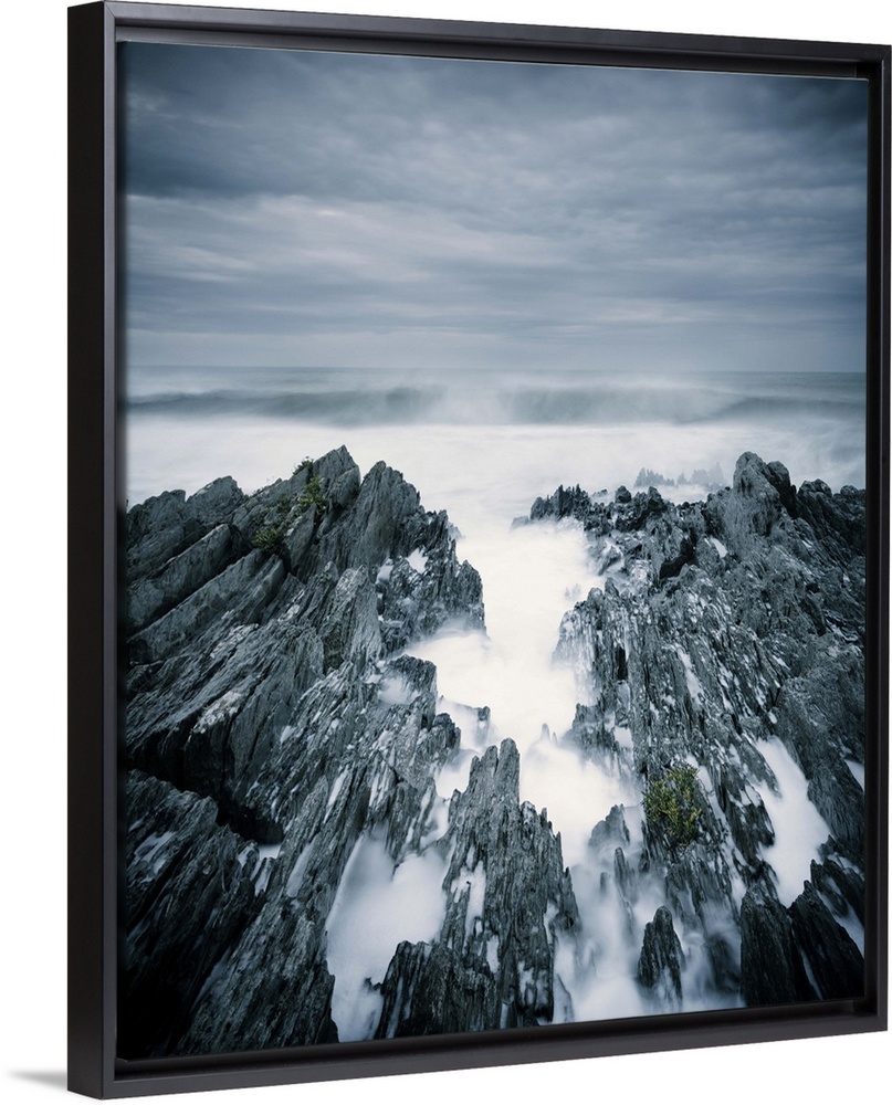 <p>Rough sea with surf and rugged rocks under stormy sky</p>
