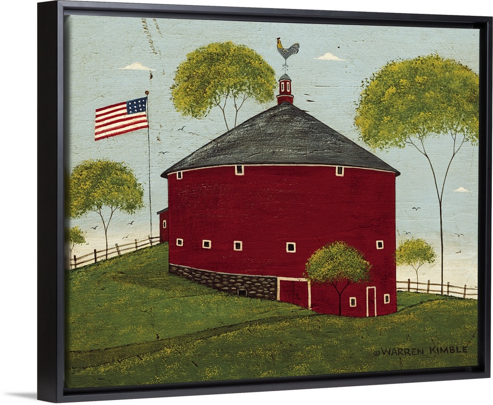<p>Horizontal, folk art painting on a big wall hanging of a red, round barn on a hillside, surrounded by trees and an American Flag.</p>