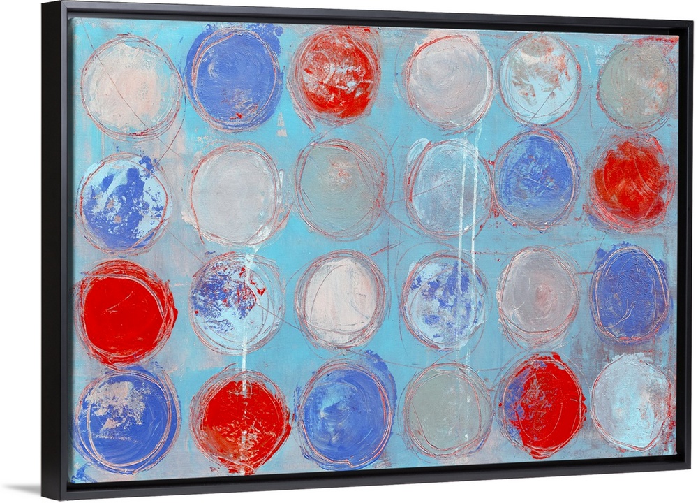 <p>A contemporary abstract painting of colorful circles against a pale blue background.</p>