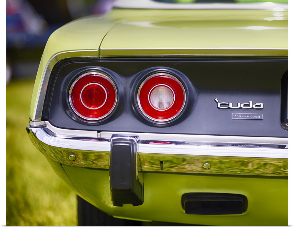 <p>Round Tail Lights and Shiny Chrome Bumper of a Plymouth 1971 Barracuda Muscle Car, New Jersey</p>