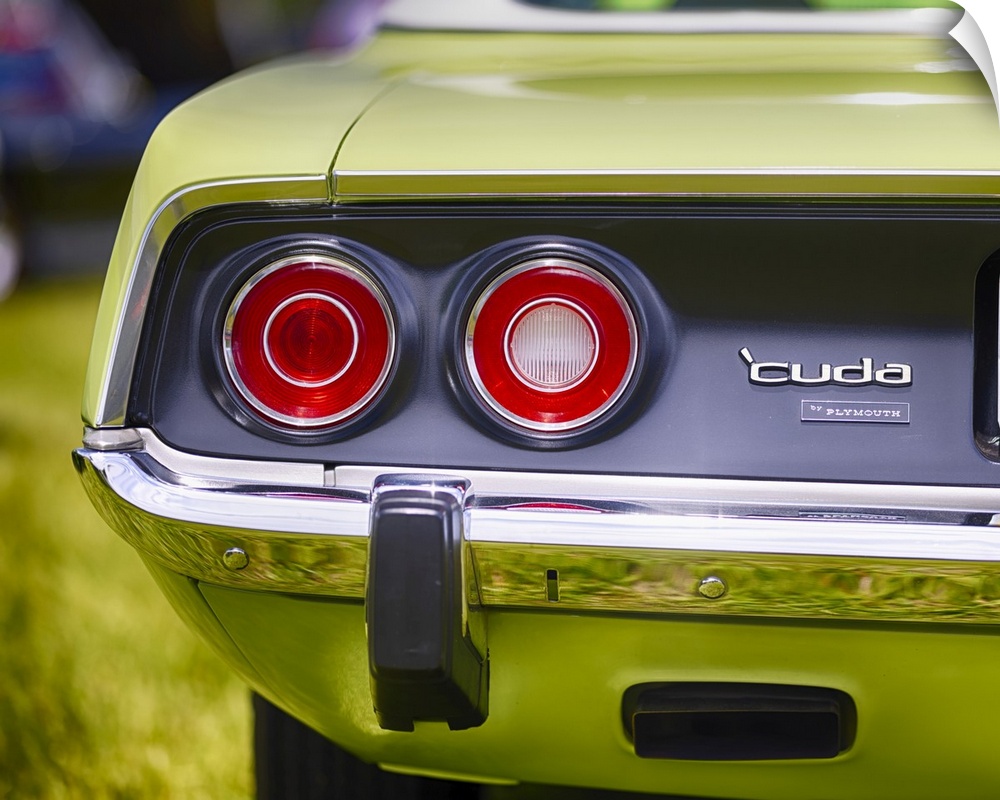 <p>Round Tail Lights and Shiny Chrome Bumper of a Plymouth 1971 Barracuda Muscle Car, New Jersey</p>