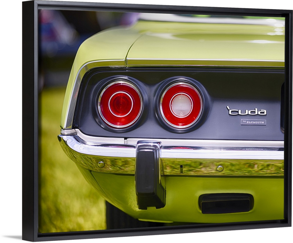 <p>Round Tail Lights and Shiny Chrome Bumper of a Plymouth 1971 Barracuda Muscle Car, New Jersey</p>