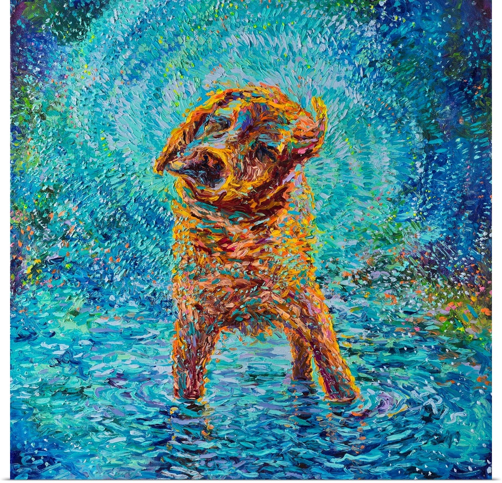 <p>Brightly colored contemporary artwork of a dog standing in water shaking.</p>