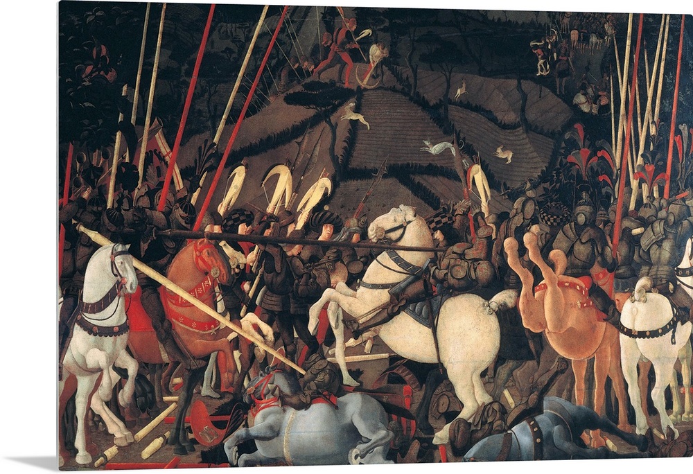 <p>Rout of St Roman (Battle of St Roman), by Paolo di Dono know as Paolo Uccello, 1436 - 1439 about, 15th Century, tempera on panel, cm 182 x 323 - Italy, Tuscany, Florence, Uffizi Gallery. In the Gallery collections since 1784. All. Scene of equestrian batt</p>