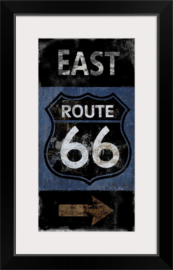 <p>East Route 66 vintage sign in black, white, blue, and copper.</p>