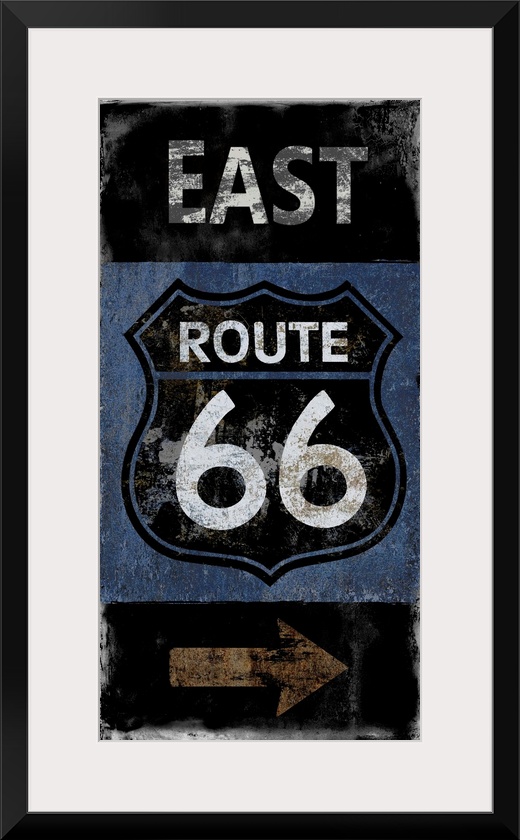 <p>East Route 66 vintage sign in black, white, blue, and copper.</p>