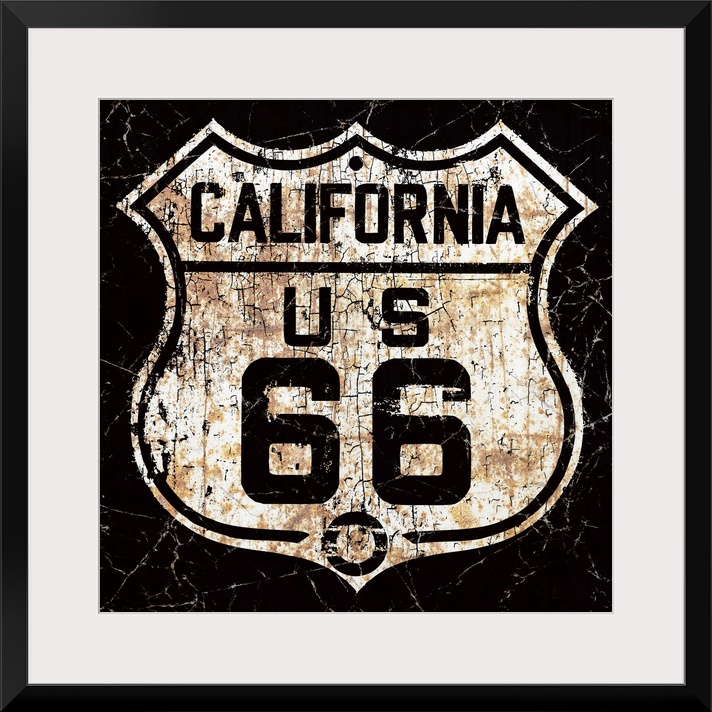 <p>A back and white, worn, distressed and rusty vintage Route 66 street sign.</p>