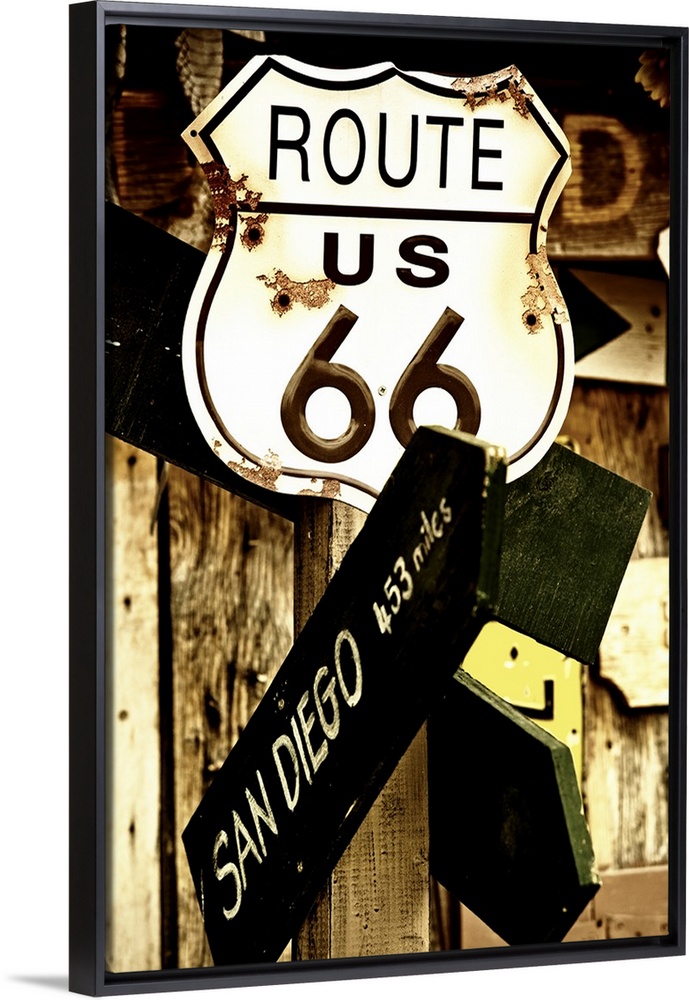 <p>A rusted metal sign for Route 66 and a direction sign pointing towards San Diego.</p>