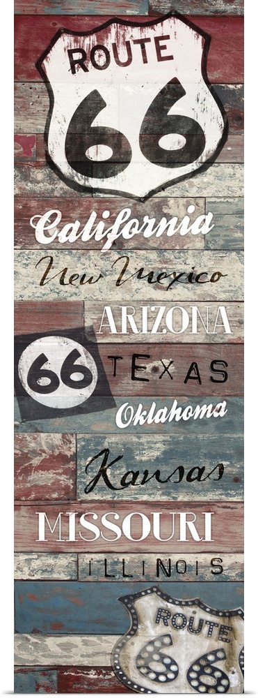 <p>Vertical artwork depicting "route 66" signs with state names.</p>