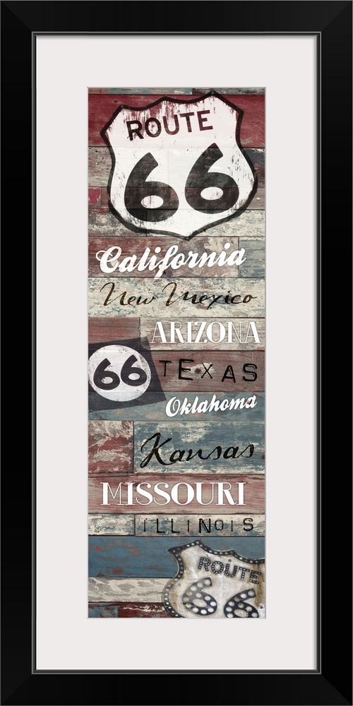 <p>Vertical artwork depicting "route 66" signs with state names.</p>