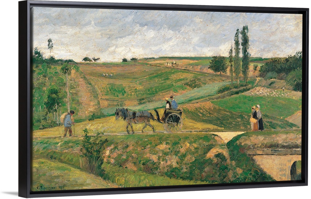 <p>Route dEnnery, by Camille Pissarro, 1874 about, 19th Century, oil on canvas, cm 55 x 92 - France, Ile de France, Paris, Muse dOrsay, RF1973-19. All. Landscape road route dEnnery near Pontoise trees green field lawn gig horse bridge clouds sky azure light</p>