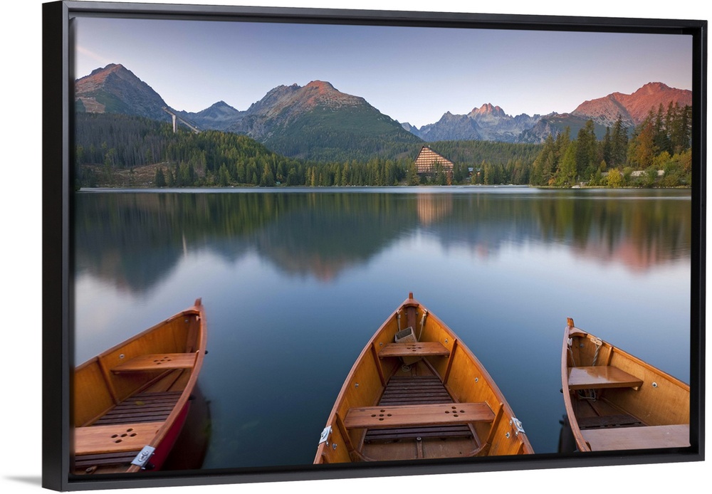 <p>Rowing boats and mountains beneath a twilight sky, Strbske Pleso Lake in the High Tatras, Slovakia, Europe. Autumn</p>