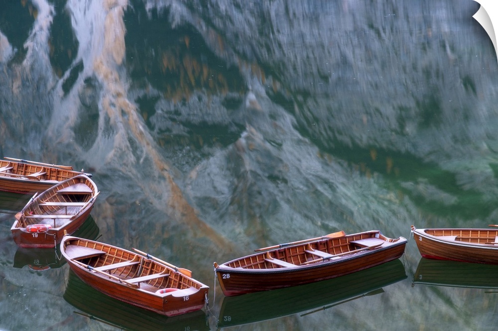 <p>Row boats floating in the Braies lake on a calm morning, with the mountains reflecting in the water. Dolomites, Italy.</p>