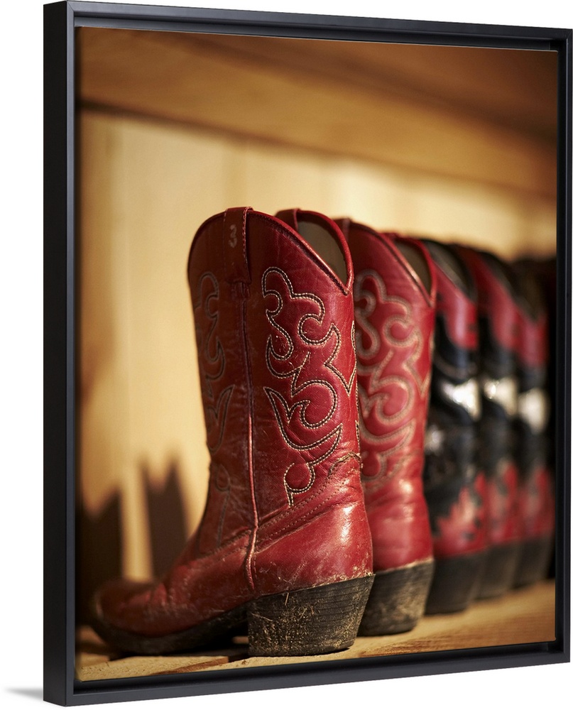 <p>Row of cowboy boots sitting on a shelf</p>