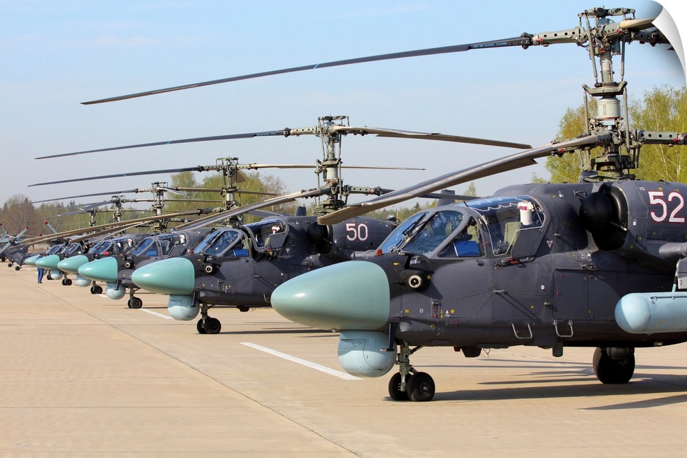 <p>Row of Ka-52 Alligator attack helicopters of the Russian Air Force.</p>