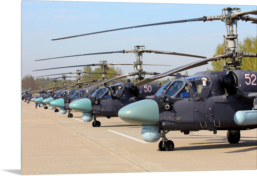 <p>Row of Ka-52 Alligator attack helicopters of the Russian Air Force.</p>
