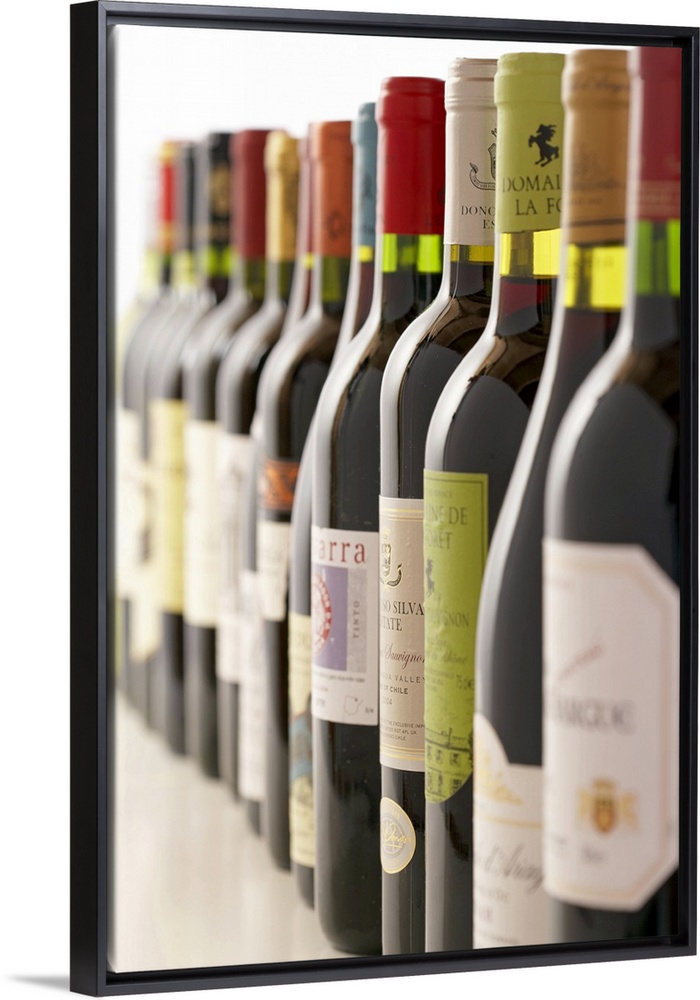 <p>Artwork perfect for the home or kitchen showing a line of red wine bottles taken at an angle with the bottles toward the end fading out of focus.</p>