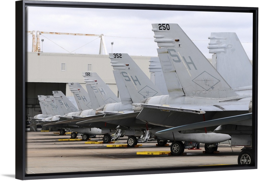 <p>Row of U.S. Marine Corps F/A-18 Hornet tail fins at MCAS Miramar.</p>