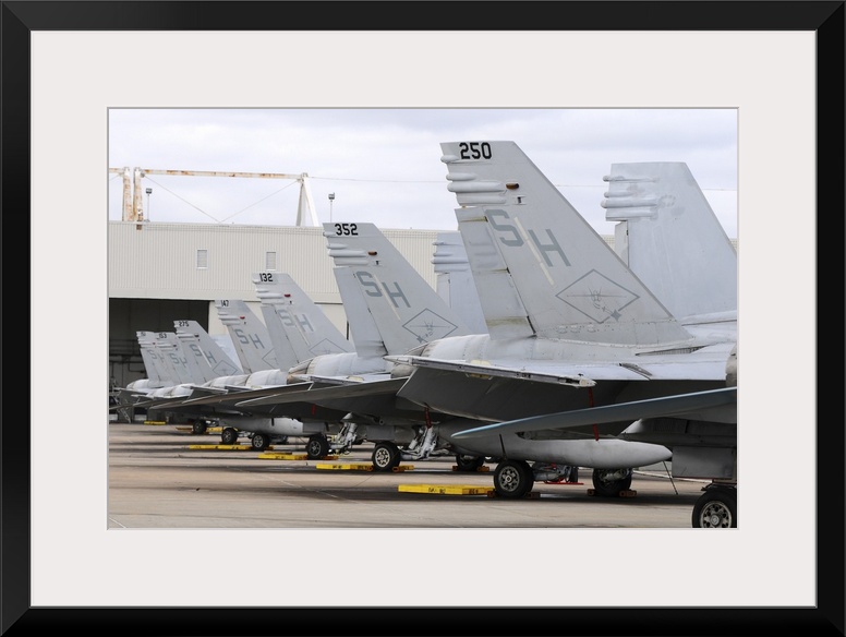 <p>Row of U.S. Marine Corps F/A-18 Hornet tail fins at MCAS Miramar.</p>