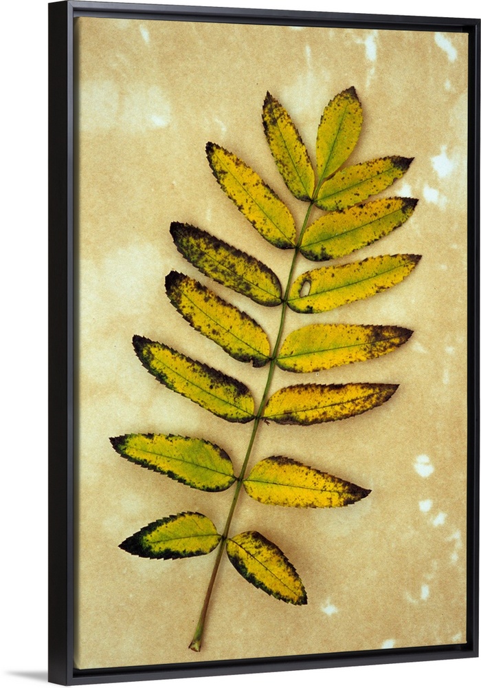 <p>Single sprig of yellow autumn leaves of Rowan or Mountain ash or Sorbus aucuparia lying on antique paper</p>