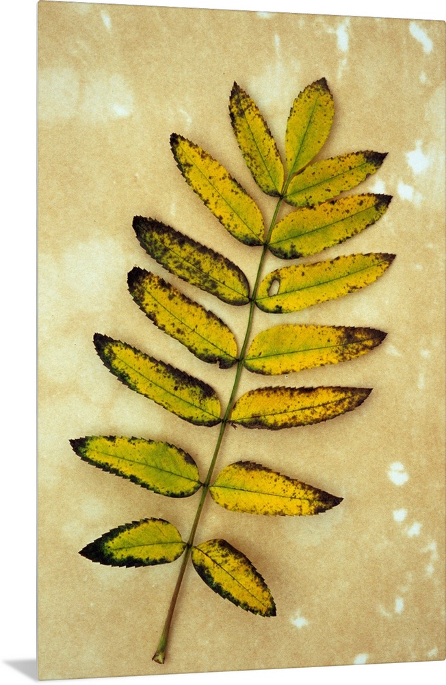 <p>Single sprig of yellow autumn leaves of Rowan or Mountain ash or Sorbus aucuparia lying on antique paper</p>