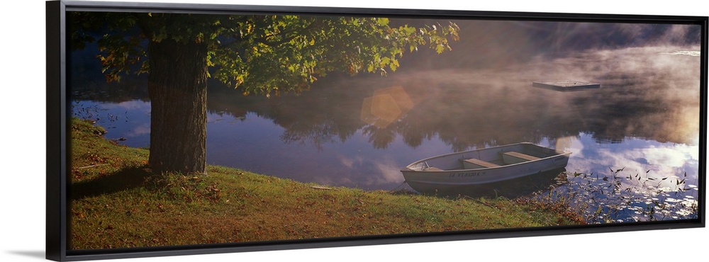 <p>Small boat resting on the shore of a misty lake next to a sturdy tree, the surrounding forest reflected in the water.</p>