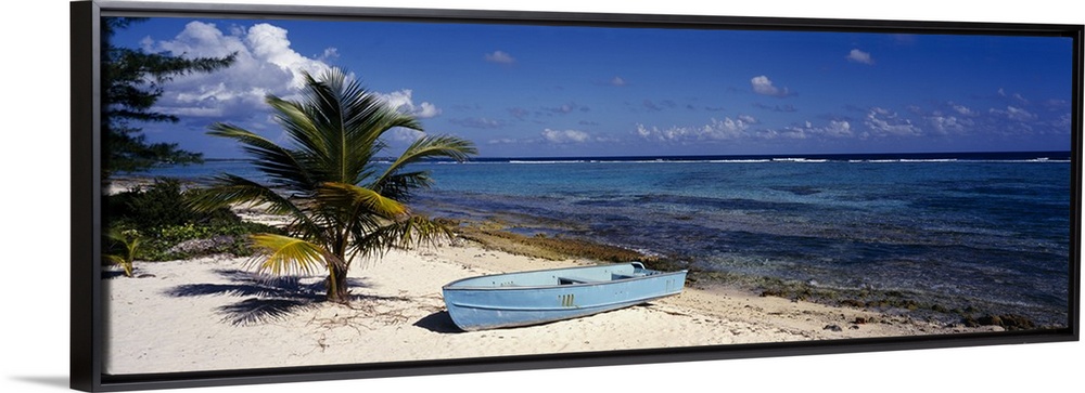 <p>A single boat resting on the sandy shore next to a young palm tree and the tropical ocean water in the Caribbean.</p>