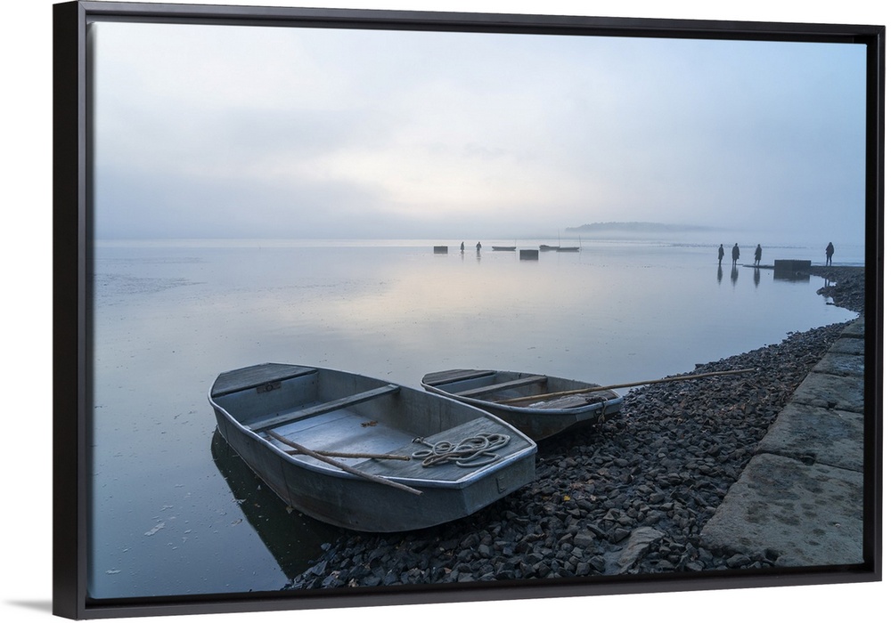 <p>Rowing boats on shore with fishermen in background preparing for fish harvest on foggy morning, Rozmberk Pond, UNESCO Biosphere, Trebon, Jindrichuv Hradec District, South Bohemian Region, Czech Republic (Czechia), Europe</p>