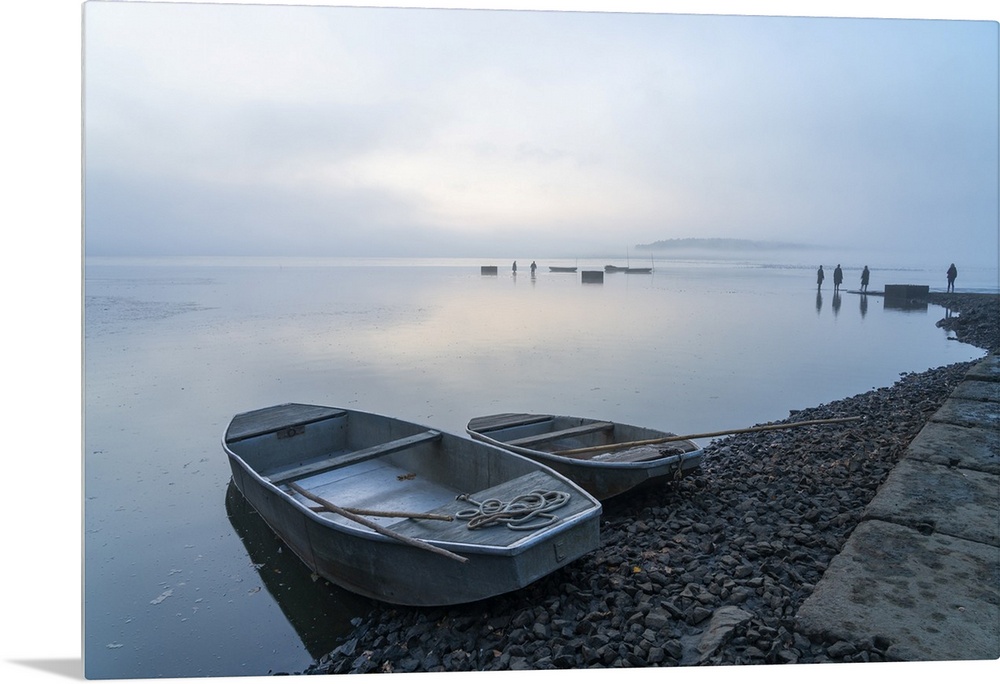 <p>Rowing boats on shore with fishermen in background preparing for fish harvest on foggy morning, Rozmberk Pond, UNESCO Biosphere, Trebon, Jindrichuv Hradec District, South Bohemian Region, Czech Republic (Czechia), Europe</p>