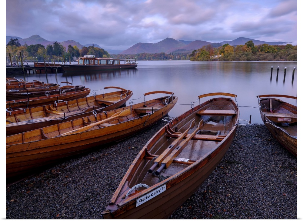 <p>Rowing boats on the shore of Derwent Water at Keswick in the English Lake District.</p>