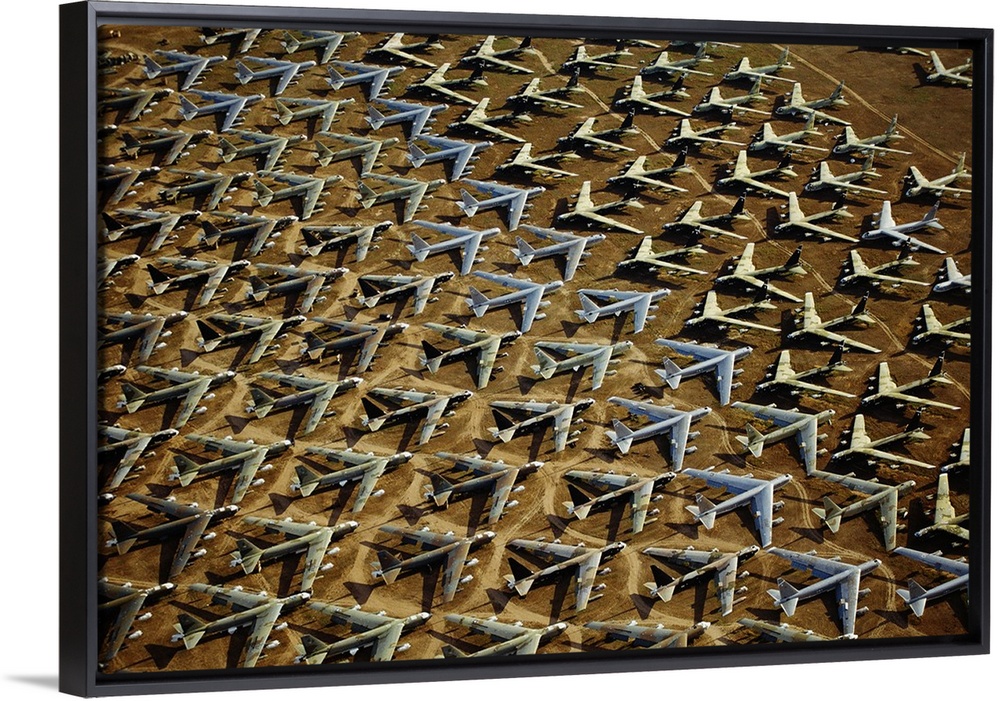 <p>Field of retired airplanes arranged in a geometric pattern in the desert, shining in the sunlight and casting dark shadows.</p>
