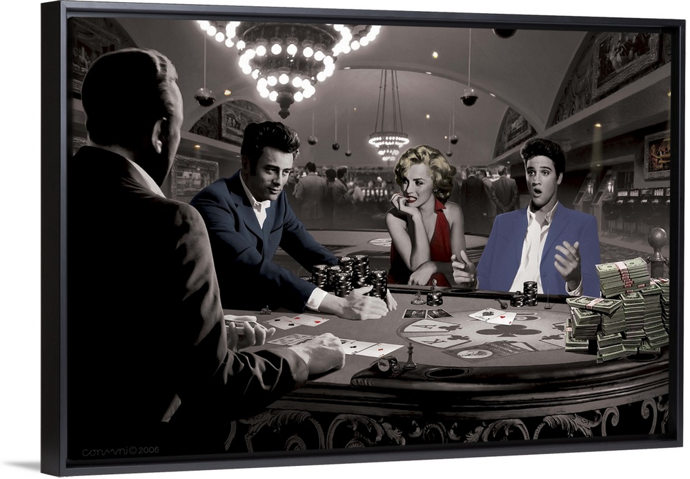 <p>Painting of James Dean, Elvis Presley, Humphrey Bogart, and Marilyn Monroe playing cards together in Las Vegas.</p>