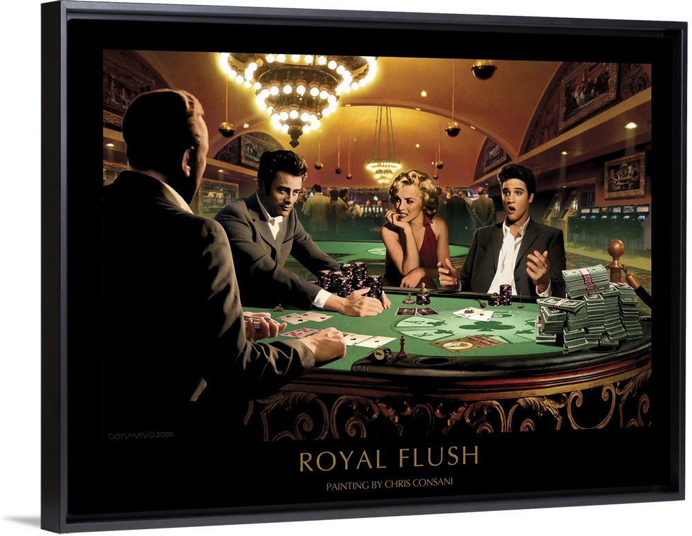 <p>Painting of James Dean, Elvis Presley, Humphrey Bogart, and Marilyn Monroe playing cards together in Las Vegas.</p>