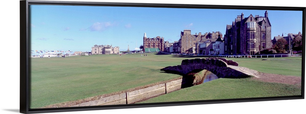 <p>Panoramic photograph shows Swilcan Bridge connecting two fairways in The Royal and Ancient Golf Club of St. Andrews in Scotland on a sunny day. Surrounding the perimeter of the golf course are antique buildings and the clubhouse in the distance.</p>