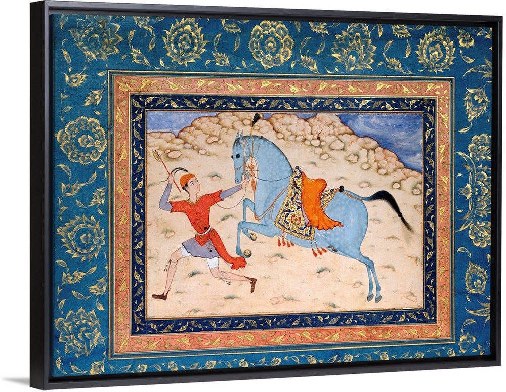 <p>The drawing of the blue-gray horse, its rich saddle, and the bare, rocky landscape are in a Persian vein, while the groom, with his small, tight turban, is rendered in the contemporary Mughal style.</p>