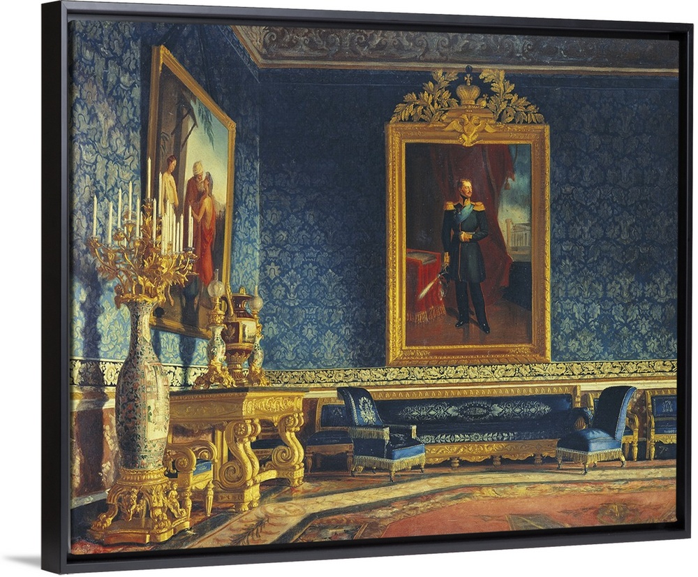 <p>Indoor Portrait of Royal Palace of Naples with a Portrait of Tsar Nicholas I (Interno del Palazzo Reale di Napoli con ritratto dello Zar Nicola I), by Frans Vervloet, 19th Century, oil on canvas, Whole artwork view. View of the Fourth Living Room of the Queen within the Royal Palace of Naples, one of the residences of the royal house of Bourbons; here can be seen a sofa with two chairs in the middle, a precious table with two thin candlesticks and a small vase; on the left, an elegant Empire style candleholder with leonine paws; hanging on the central wall, a portrait of Tsar Nicholas I, commissioned from Ferdinand the Second to the painter Ajwazosky, while on the left wall is a Classic subject painting., Oil on canvas.</p>