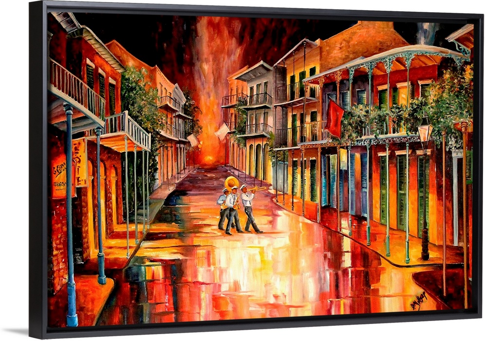 <p>Contemporary artwork that uses bright colors to paint a street lined with buildings in New Orleans with three musicians playing in the center of the street.</p>