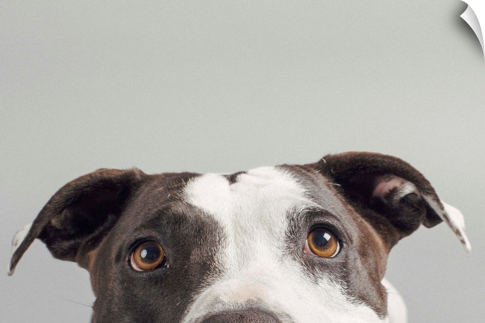 <p>Portrait of a pit bull with large brown eyes.</p>