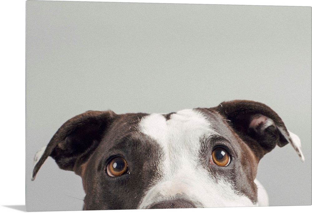 <p>Portrait of a pit bull with large brown eyes.</p>