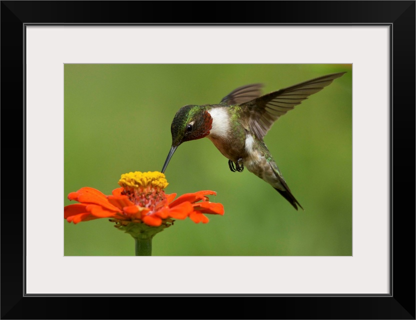 <p>A male Ruby Throated Hummingbird visiting a Zinnia bloom.</p>