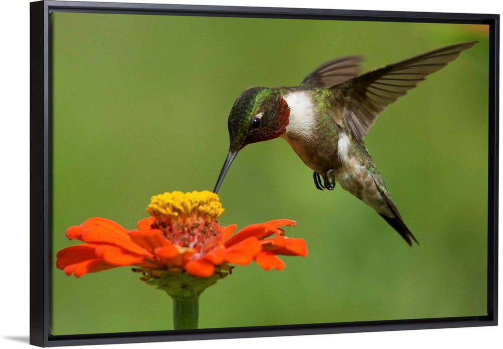 <p>A male Ruby Throated Hummingbird visiting a Zinnia bloom.</p>