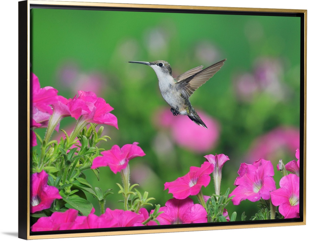 <p>Ruby-throated Hummingbird (Archilochus colubris), female in flight feeding on Petunia flowers, Hill Country, Texas, USA</p>