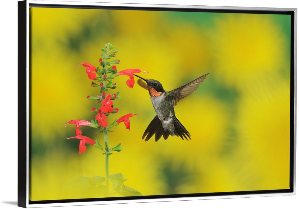 <p>Ruby-throated Hummingbird (Archilochus colubris), male in flight feeding on Tropical Sage (Salvia coccinea) flower, Hill Country, Texas, USA</p>