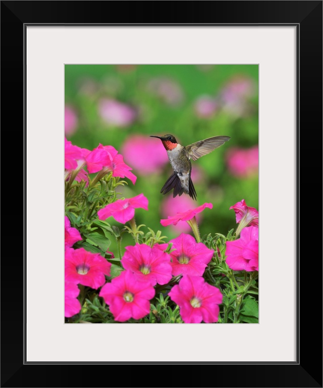 <p>Ruby-throated Hummingbird (Archilochus colubris), male in flight feeding on Petunia flowers, Hill Country, Texas, USA</p>
