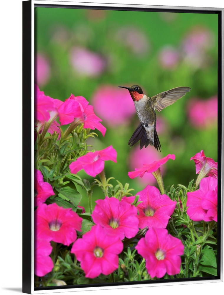 <p>Ruby-throated Hummingbird (Archilochus colubris), male in flight feeding on Petunia flowers, Hill Country, Texas, USA</p>
